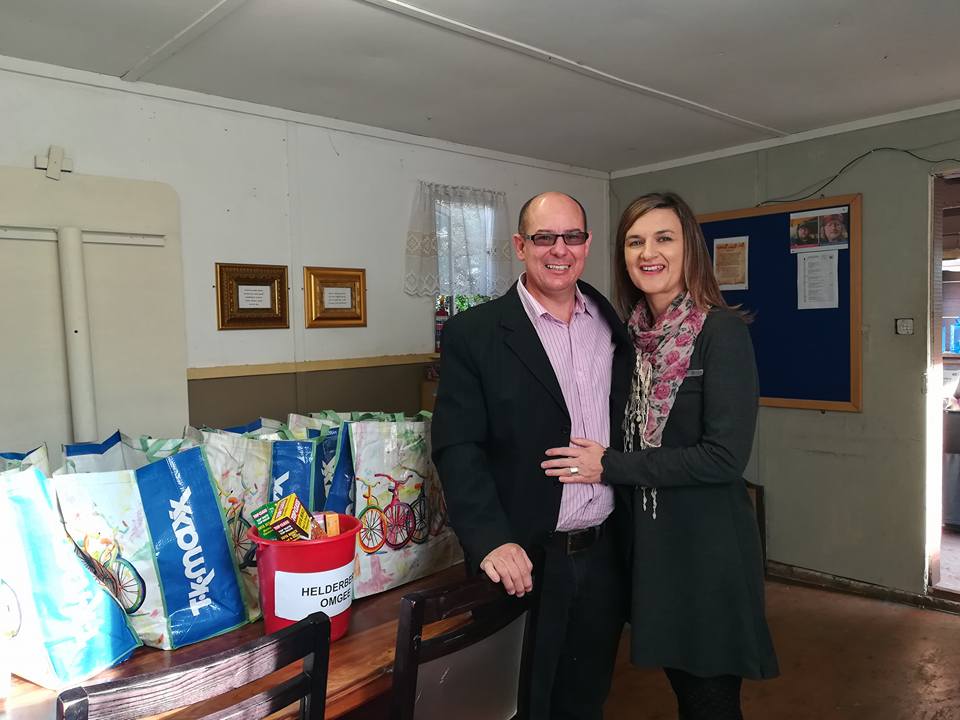 Piet van Helderberg Omgee neem ontvangs van kruideniersware geskenk deur NG Gordonbaai se emmers vol hoop projek - Herman Lourens oor handig die skenkings.