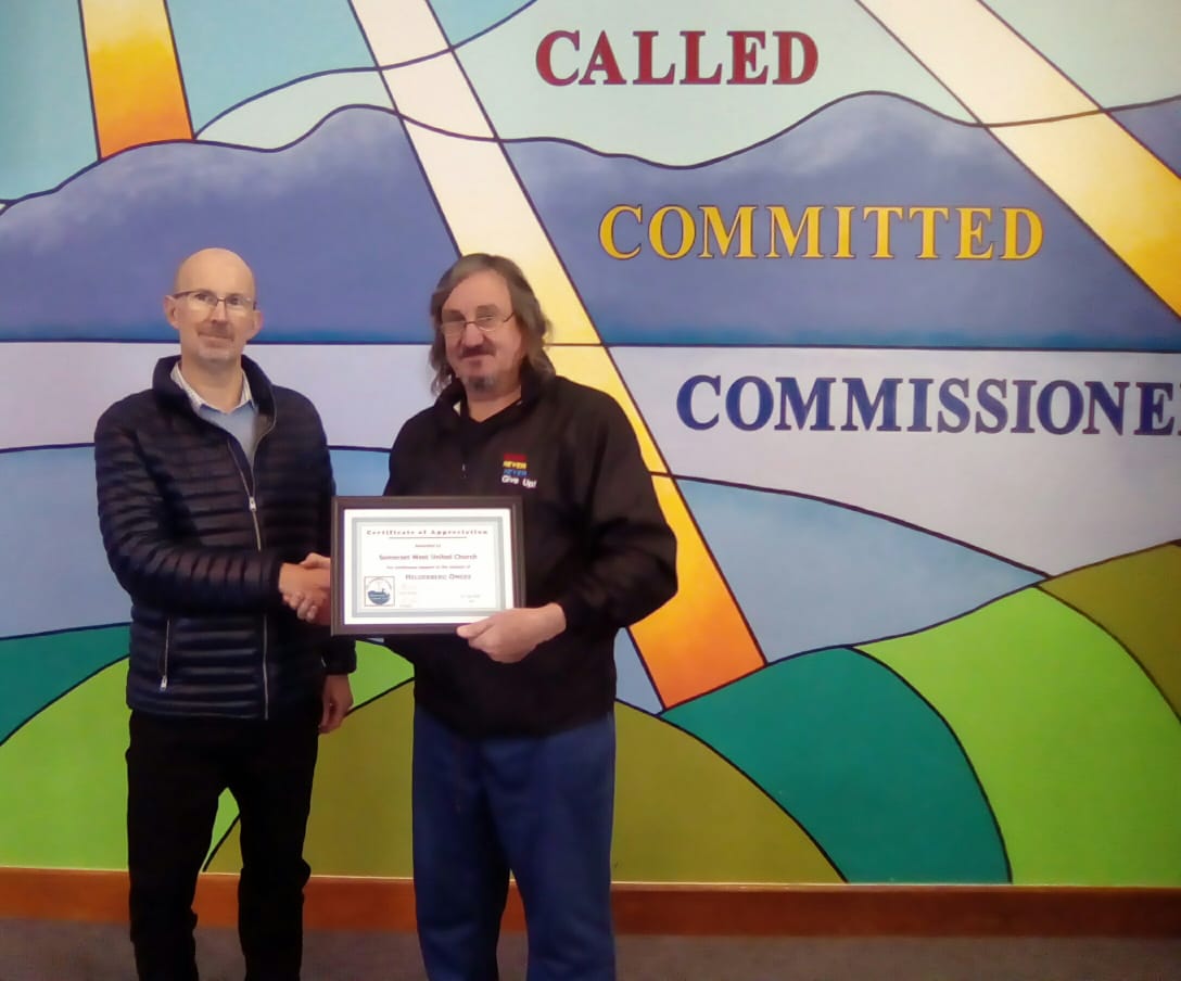 Sertifikaat van waardering aan Pastoor Tim Hawkridge van die Somerset West United Church vir voortgesette ondersteuning aan Helderberg Omgee